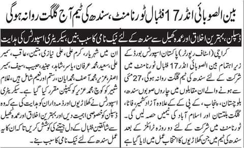 Sindh Sports Board U17 final Squad: Shehryar, Karam Ali, Ali Niazi, Mateen, Aaqib, Sameer Ali, Saeed, Muhammad Irfan, Yasir, Shahid, Junaid, Habib, Saif, Sameer Asghar, Muhammad Aziz (captain), Muhammad Asif, Muhammad Ayan, Rustam, and Naeem. Coach is Ghulam Shabir.