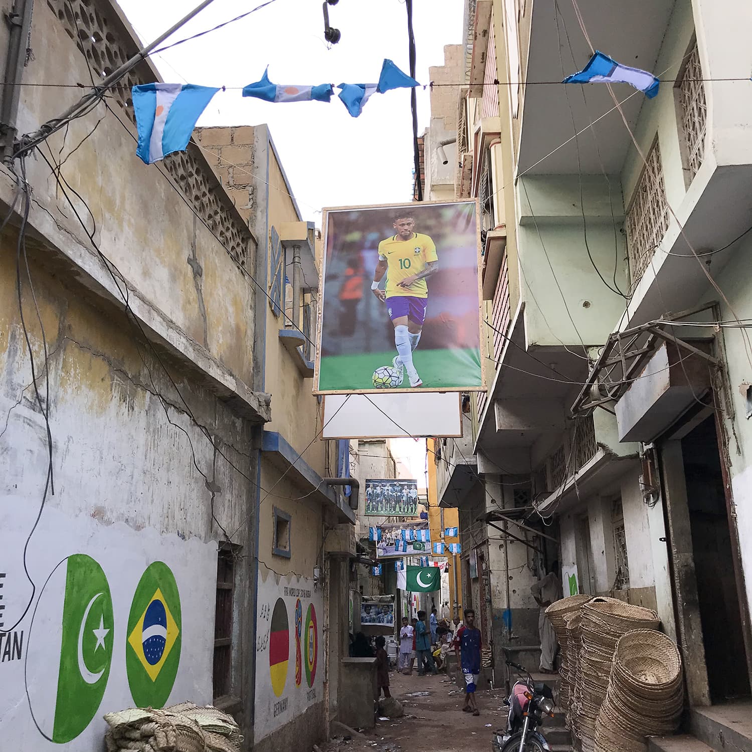 I had come to see firsthand how the Lyariwallas celebrated the arrival of the 2018 FIFA World Cup. We met at the multicoloured Kiran Street in the Baghdadi neighbourhood. The entire lane is painted in the hues of the rainbow.
